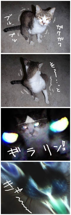 みなさん今晩は。 今夜は怪奇現象が頻発しているという 無人の廃屋に取材に来ています。 2) ウワサ通り、辺りには異様な気配が漂い 今にもわたくしの背後から何か 恐ろしいモノが現れそうな・・・・・ 3) (ぐぉろにゃああああああああん!!!) ギラリン☆ 4) っきゃあああああああああああああああ ああああああああああああ!!!!! |