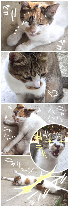 どうかお許しください! わたしには帰りを待つ年老いた母と幼い妹が・・・ どうか、このとおりですぅぅぅぅ(涙) 2) ふぅ・・・ 罪を憎んで、人を憎まず。 ファミリーを大事にするがよい。 さらばだ。 3) ニャハハハ、ニャッハハハハハハ! マヌケ侍が、わたしの色香にコロッと騙されおってからに。 ぬぅぁああにいいいいいい!?!?!??!!! ギラリンッ!! 4) 許さんっっ! ズバッ!! ま、まだ近くにいたのねぇ〜っ!? ニャ〜ッ! っていうかnear? あら、寒かったかしら? それじゃまた来週〜。(ガクッ) |